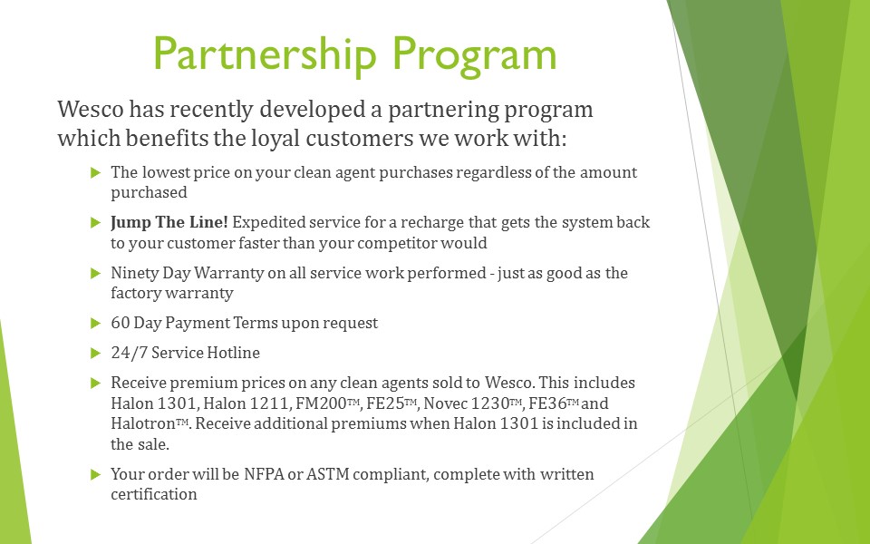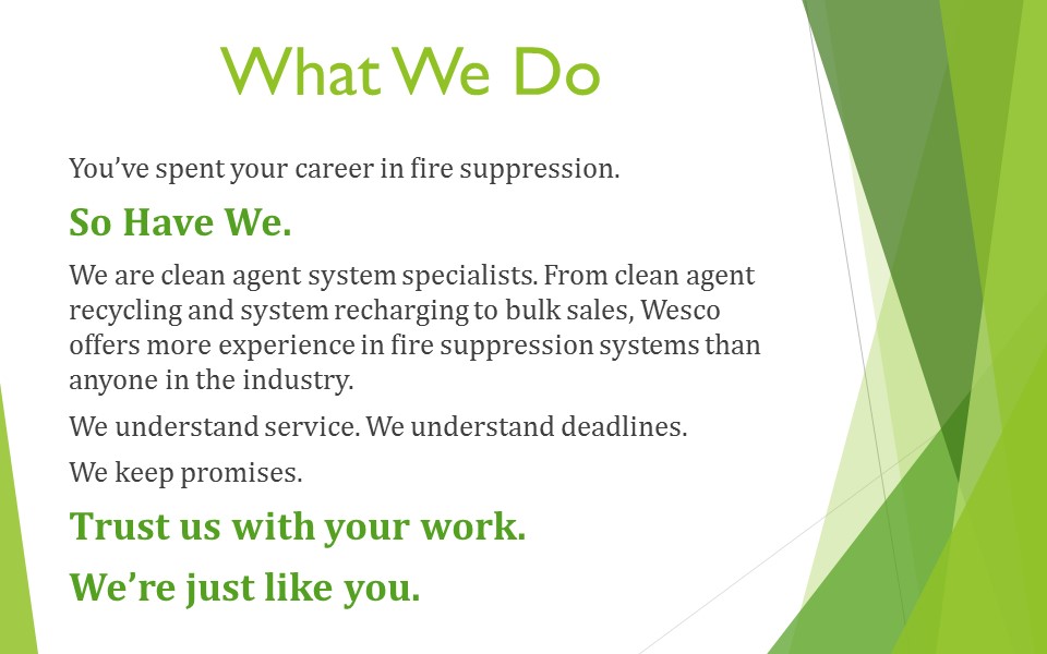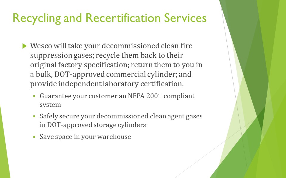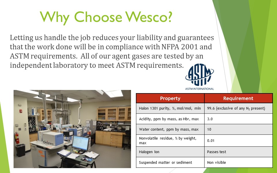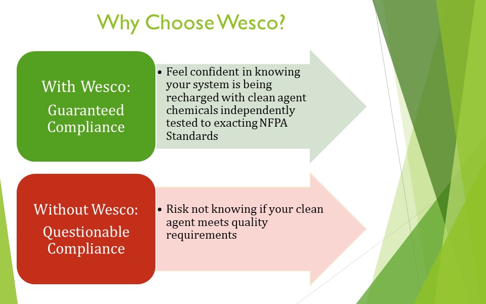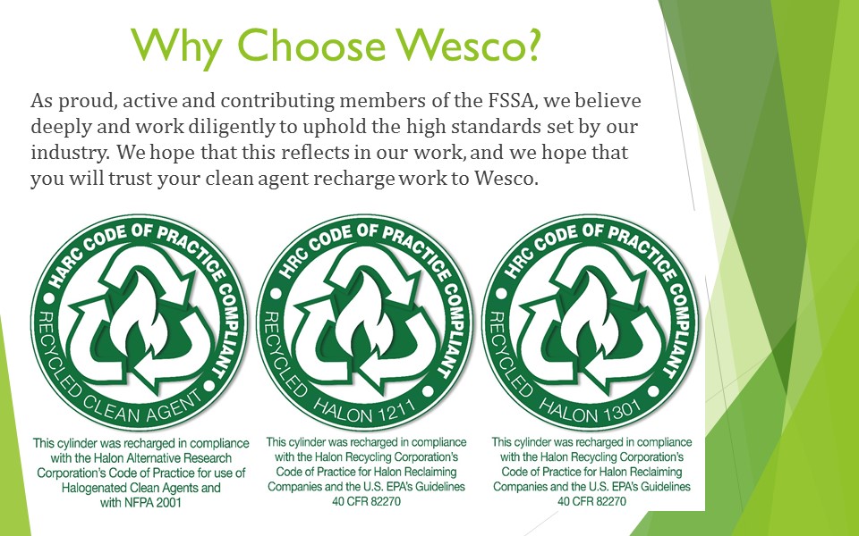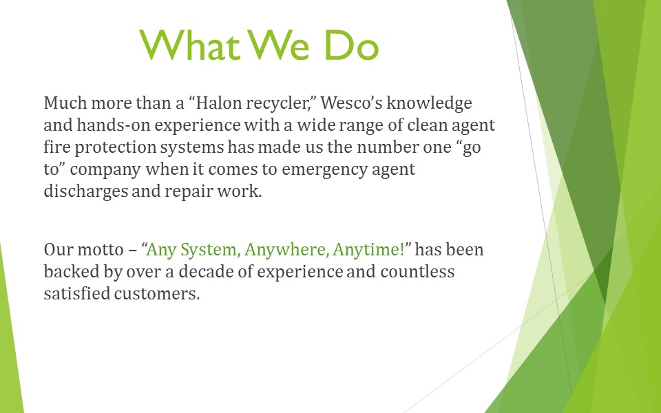 Much more than a “Halon recycler,” Wesco’s knowledge and hands-on experience with a wide range of clean agent fire protection systems have made us the number one “go to” company when it comes to emergency agent discharges and repair work. Our motto – “Any System, Anywhere, Anytime!” – has been backed up by over a decade of experience and countless satisfied customers.